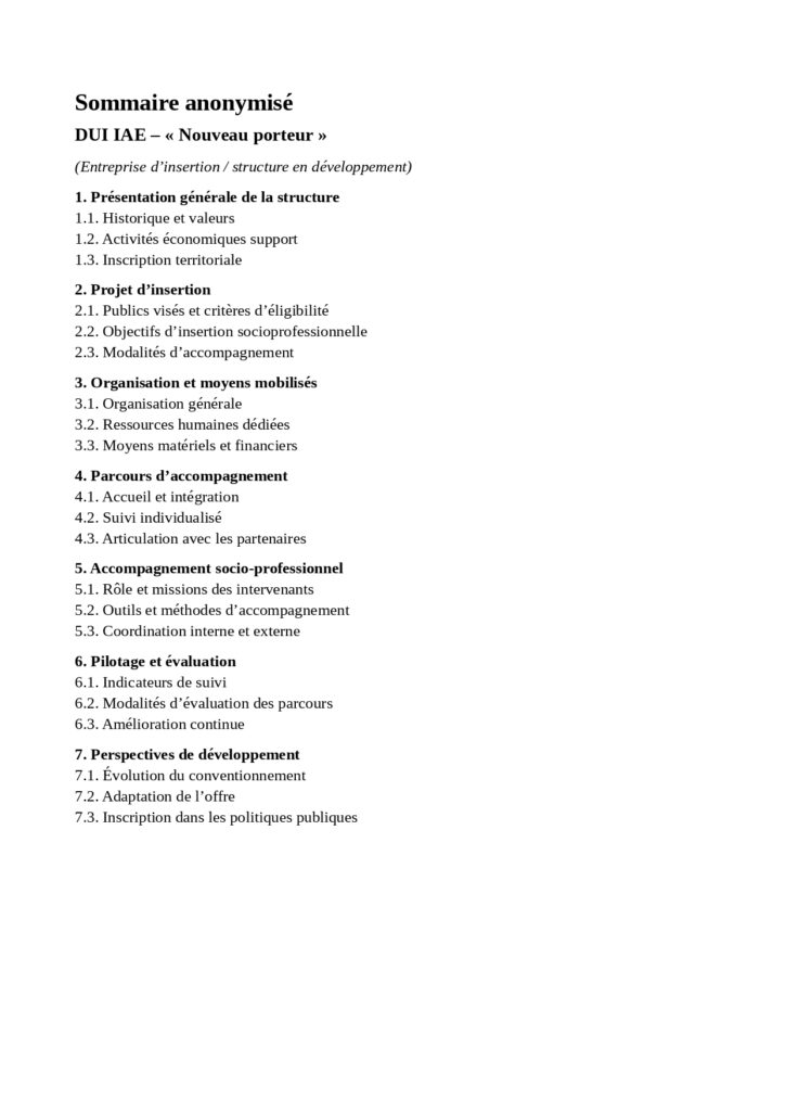 Ce document présente un sommaire anonymisé, à titre illustratif, d’un DUI IAE – “nouveau porteur”, destiné à une entreprise d’insertion ou une structure en phase de développement.