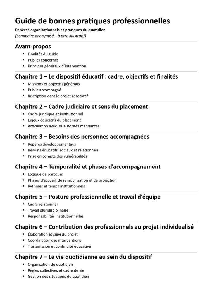 Ce document présente un sommaire anonymisé, à titre illustratif, d’un guide de bonnes pratiques professionnelles destiné à un dispositif relevant de la protection de l’enfance.